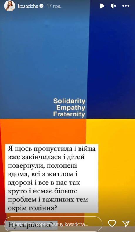 "Я щось пропустила? І війна вже закінчилась, і дітей повернули, і полонені вдома, всі з житлом і здорові, і все в нас так круто, і немає більше проблем і важливих тем, окрім гоління? Ну серйозно?" — зазначила Катерина Осадча.