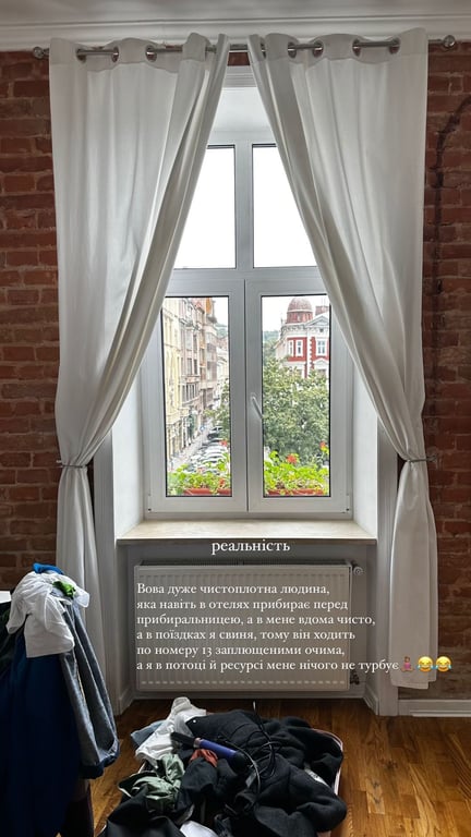 "В мене вдома чисто, а в поїздках я свиня. Тому він ходить по номеру із заплющеними очима, а я в потоці і в ресурсі, мене нічого не турбує", — розповіла Катерина у сторіс в Instagram.