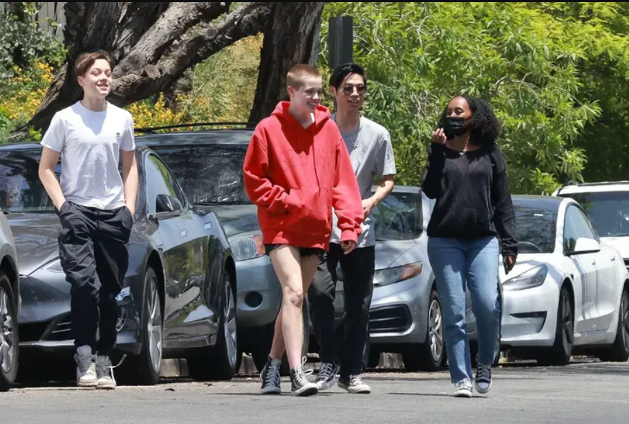 Фотографи зустріли 19-річного Пакса, 18-річну Захару (вона чомусь була в чорній медичній масці), 17-річну Шайло та 14-річного Нокса, коли ті прямували до одного з кафе, що розташоване неподалік будинку Анджеліни Джолі у Каліфорнії.