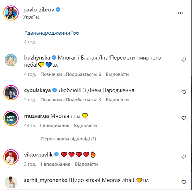 Також зірковий іменинник подякував ЗСУ за "світлий ранок". Одними з перших Зіброва в коментарях привітали співачки Катерина Бужинська, Оля Цибульська та співак Віктор Павлік.