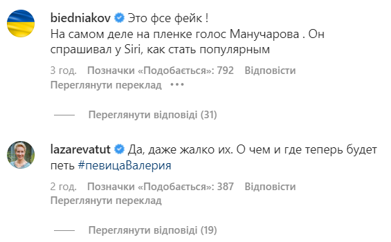 Під публікацією свої коментарі залишили український шоумен Андрій Бєдняков та російська гумористка Тетяна Лазарєва, яка підтримує Україну та живе в Іспанії.
