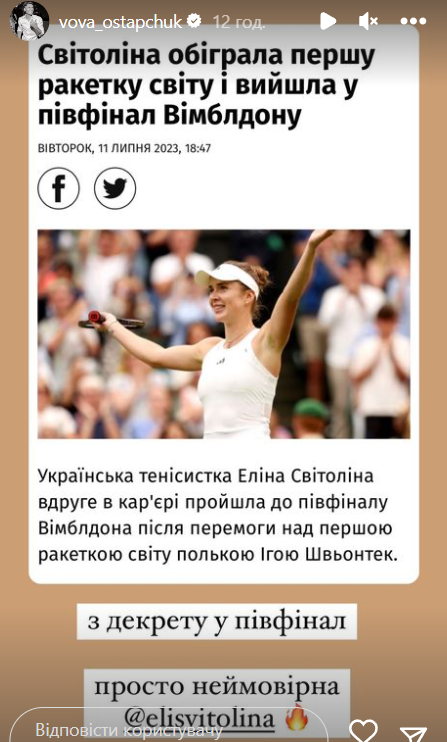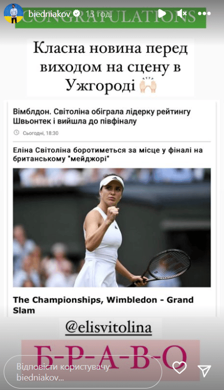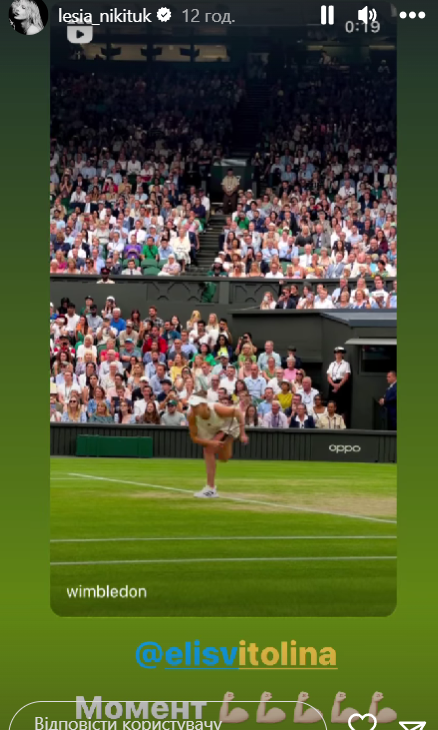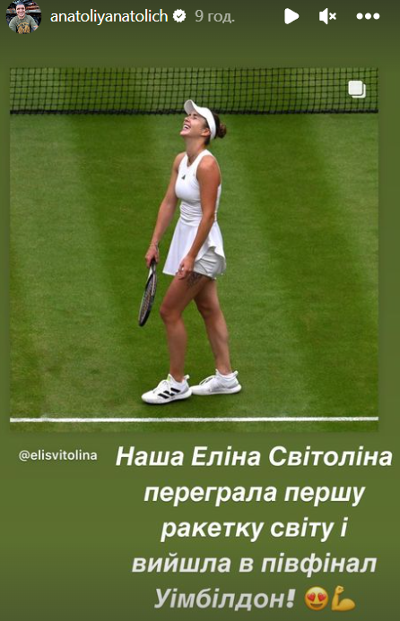 Напередодні українська тенісистка Еліна Світоліна перемогла першу ракетку світу, полячку Ігу Свьонтек, та потрапила до півфіналу престижного турніру "Вімблдон", який зараз проходить у Великій Британії. Успіх землячки у соцмережах прокоментували й зірки українського шоу-бізнесу.