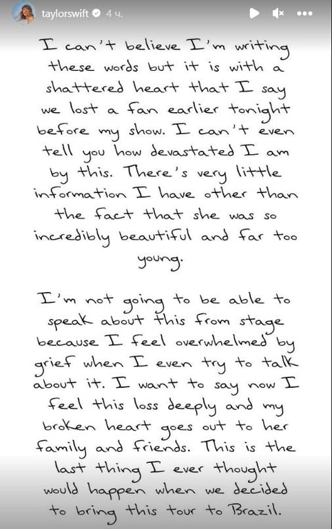 На концерті Тейлор Свіфт сталася трагедія. Фанатка артистки померла під час виступу зірки на Estádio Olímpico Nilton Santos у Ріо-де-Жанейро.