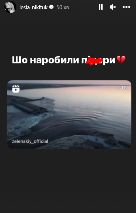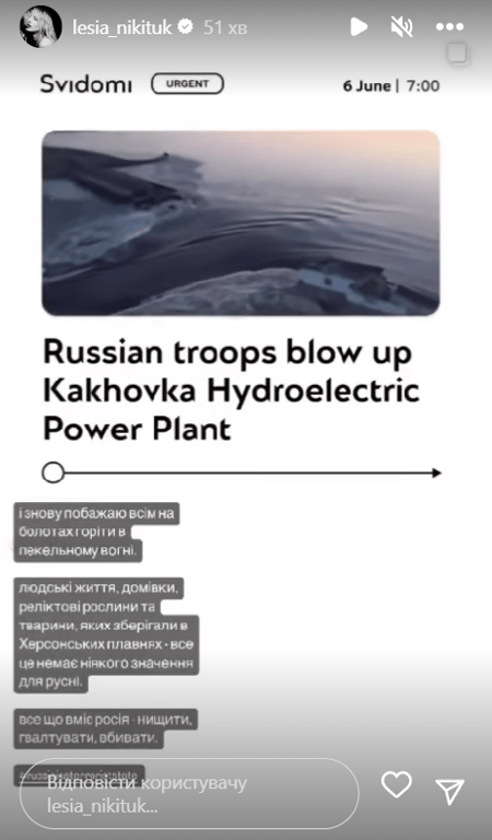 "І знову побажаю всім на болотах горіти в пекельному вогні. Людські життя, домівки, реліктові рослини та тварини, яких зберігали в Херсонських плавнях — все це не має ніякого значення для русні. Все, що вміє Росія, — нищити, гвалтувати, вбивати", — написала Нікітюк та додала інше сторіз, в якому назвала росіян так, як їх підписують чимало користувачів в соцмережах.