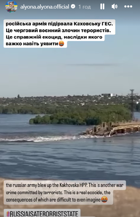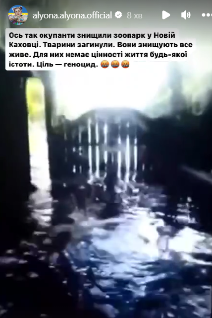 Реперка назвала теракт росіян екоцидом, наслідки якого важко уявити. Також Альона Саврененко (справжнє ім'я артистки) показала відео знищеного зоопарку в регіоні.