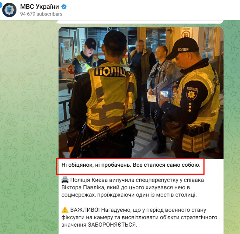 Окрім цього, поліцейські нагадали їм про заборону фіксації та висвітлення об'єктів стратегічного значення у період воєнного стану. А у соцмережах Нацполіція згадала одну з пісень Павліка — так креативно про затримання зірок давно не повідомляли.
