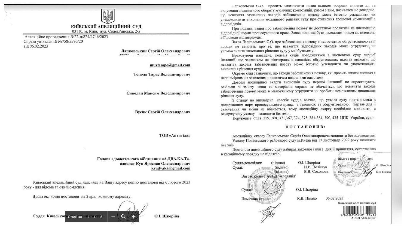 Вперше на музикантів подали до суду ще 2019 року. Житель Луцька Сергій Лапковський звинуватив "Антитіла" в тому, що вони під час створення своїх пісень нібито використали його патент на корисну модель №74516 "Спосіб налаштування параметрів музичної композиції". Фронтмен гурту Тарас Тополя з колегами змогли відстояти правду в суді. Тому апеляція під час повномасштабної війни неабияк здивувала музикантів.
