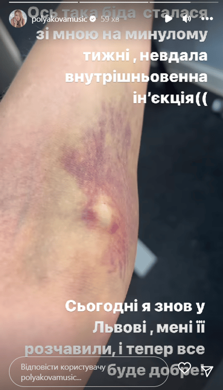 В сторіз свого Instagram Полякова розповіла, що стало причиною проблем з кінцівкою.