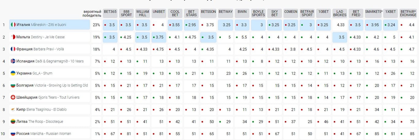 Великі шанси на перемогу, за ставками букмекерів має Францію. Barbara Співачка Pravi з емоційною композицію Voilà захопила французькою романтичністю, легкістю та вишуканістю.