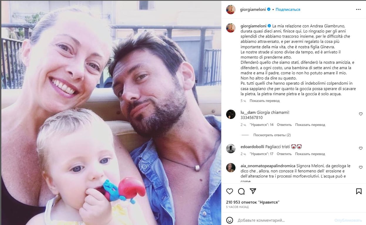 "Мої стосунки з Андреа Джамбруно, які тривали майже 10 років, закінчуються. Наші шляхи розійшлися, і настав час визнати це", — написала Мелоні у своїх соціальних мережах.