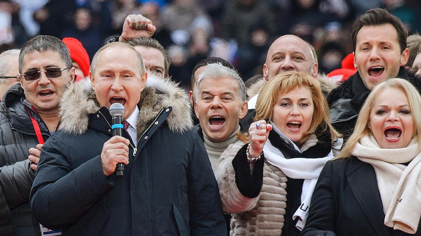 Окрім путіна, зігнану масовку розважали провладні російські артисти Григорій Лепс, Дмитро Дюжев, Дмитро Харатьян, Ольга Кормухіна, гурт "Любе" та Олег Газманов. Останній, виконуючи в "заклеєному" пуховику пісню "Господа офицеры", навіщось почав виконувати фізкультурні віджимання прямо на сцені.