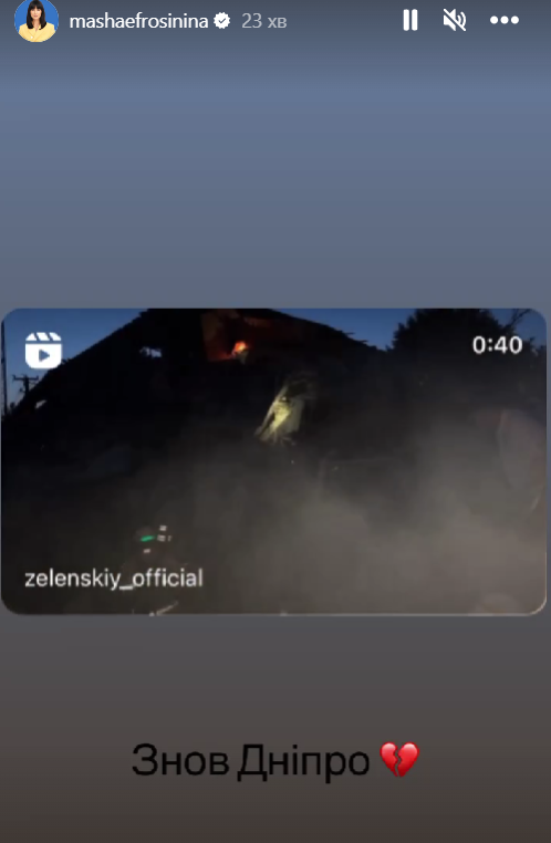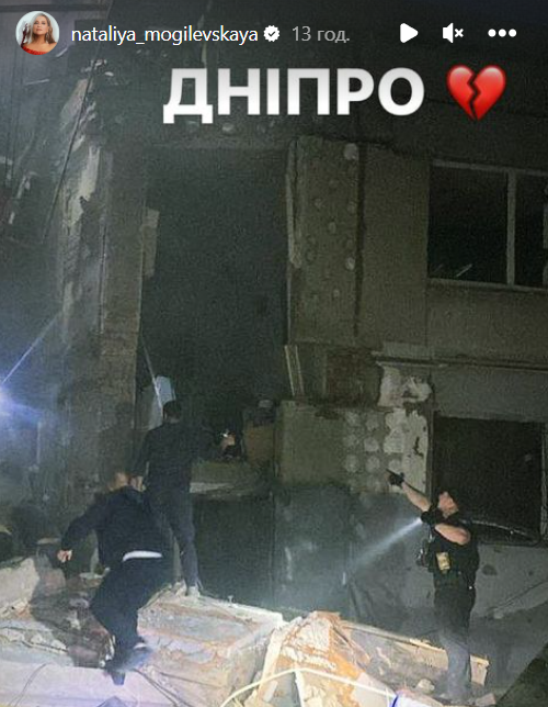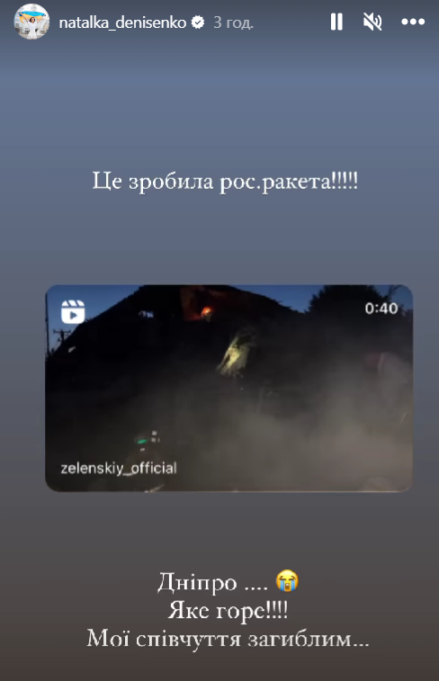 "Дніпро, знову жах! Тривога пролунала після прильоту… Люди не встигли оговтатись, як все сталося! Горе… Співчуття сім’ям загиблих", — написала акторка.