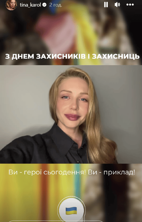 "В цей день хочу привітати всіх чоловіків, хлопців, жінок та дівчат, всіх тих, хто стоїть на захисті нашої Батьківщини. Ви сильні, стійкі, сміливі та хоробрі. І ми впевнені, що завдяки таким Героям і Героїням, як Ви, нас точно чекає Перемога! І давайте вшануємо хвилиною мовчання пам'ять всіх полеглих Героїв України в сьогоднішній війні, та всім тим, хто боровся за свободу України протягом століть", — написала співачка.