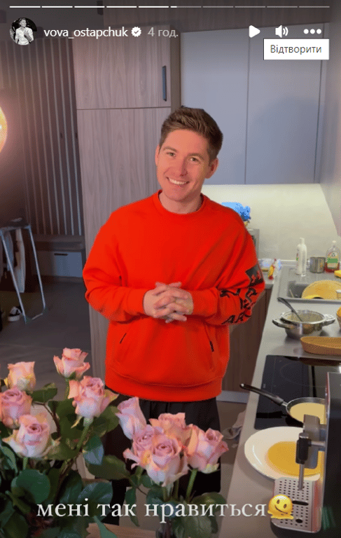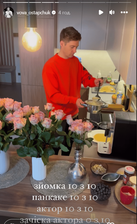 38-річний шоумен, під пильним наглядом молодшої за нього на 16 років коханої, вирішив приготувати панкейки. Остапчук, який нарешті розсекретив свою дівчину, світився на кухні від щастя, готуючи товсті млинчики.