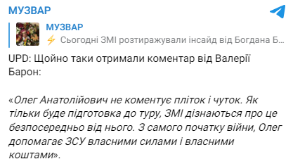 "Олег Анатольевич не комментирует сплетен и слухов. Как только будет подготовка к туру, СМИ узнают об этом непосредственно от него. С самого начала войны Олег помогает ВСУ собственными силами и собственными средствами", — утверждает Валерия Барон.