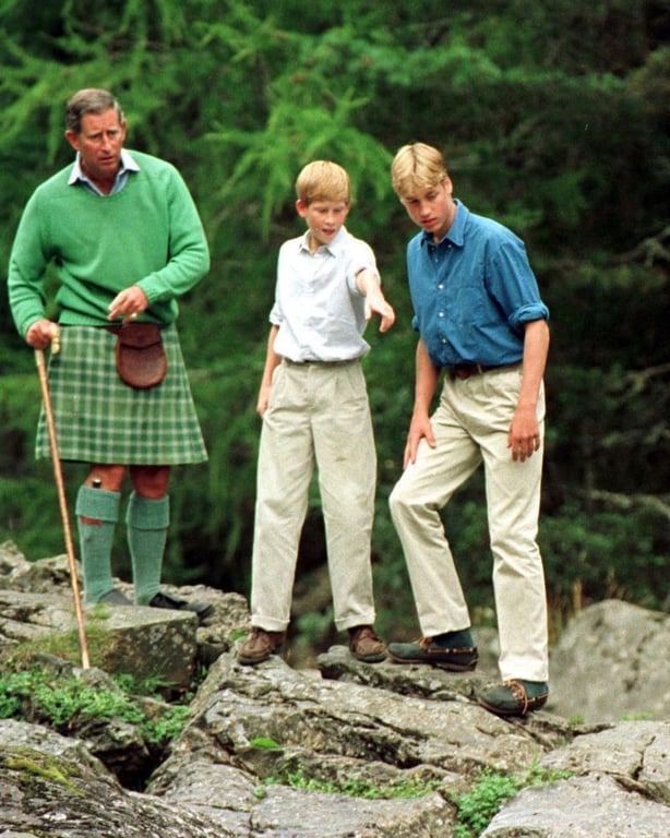 Пиар-служба Букингемского дворца опубликовала три трогательные фотографии. На одной из них Чарльз III наслаждается прогулкой по имению Балморал с еще маленькими принцами Гарри и Уильямом.