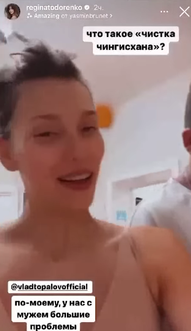 На сториз уроженка Одессы, Тодоренко, вместе с мужем, российским певцом Владом Топаловым, на своей московской кухне что-то готовят. Регина рассказывает, что у них проблемы, поэтому они решили устроить себе досуг с помощью пищевых продуктов. На видео Тодоренко говорит, что она не знает, как это объяснить.