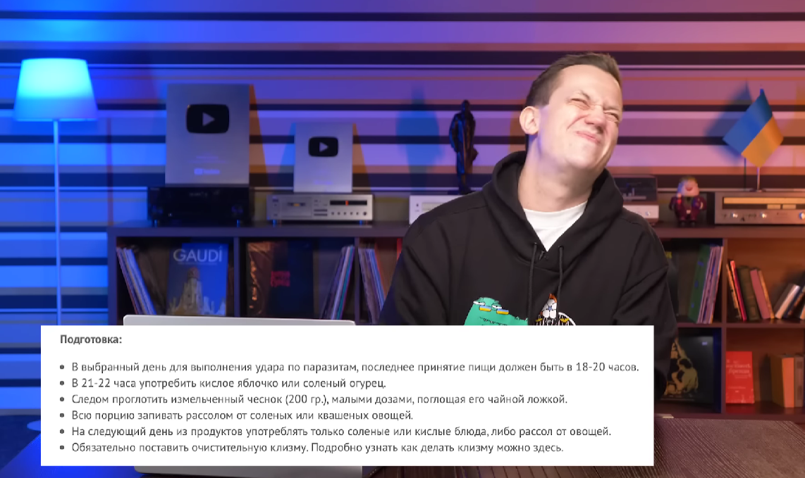 Алексей Дурнев зачитал основные этапы этого очищения. Конечно, шоумен комментировал их в своем стиле. Его больше рассмешил даже не факт о клизме, а о кислом яблочке и перечне продуктов, которыми пичкали себя путинисты.