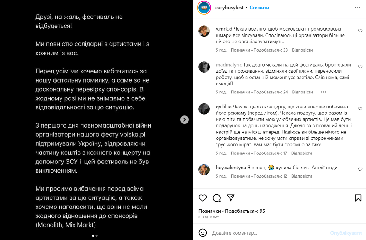 Все артисты, которые должны выступать на фестивале, узнали о русском следе мероприятия одновременно с другими пользователями соцсетей. Сначала они выразили свое возмущение, а затем большинство из них объявило о том, что не приедет в Варшаву на Easy Busy Fest.