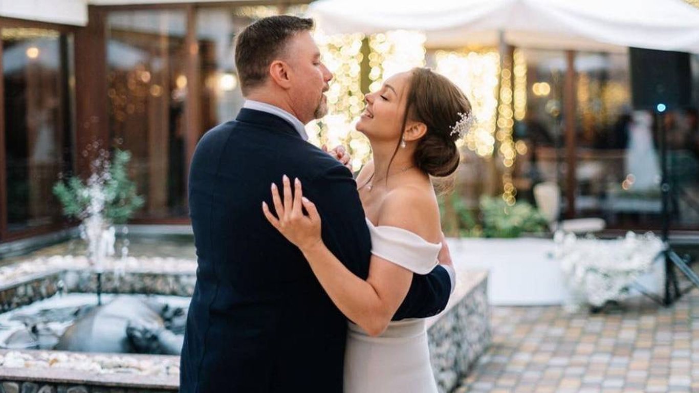 На фото жених и невеста обмениваются нежными взглядами и объятиями. Для торжественного дня Скорикова выбрала элегантное белоснежное платье с открытыми плечами. Волосы Ирины украшала нежная фата.