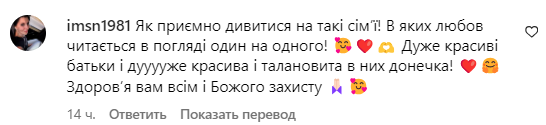 - Как приятно смотреть на такие семьи! В которых любовь читается во взоре друг на друга! Очень красивые родители и очень красивая и талантливая у них дочь! Здоровье вам всем и Божьей защиты