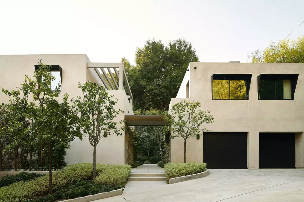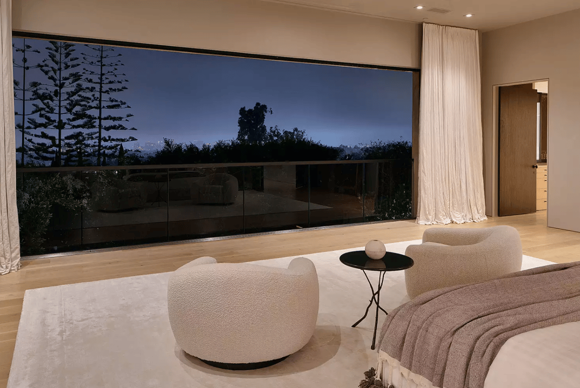 Скрытый за частной закрытой подъездной дорогой в элитном районе, особняк расположен на склоне холма с видами на горизонт Лос-Анджелеса. Построен в 1971 году. Современная архитектура компенсируется теплым, утонченным стилем во всем интерьере.