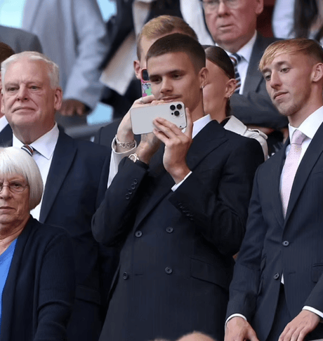 20-летний сын Дэвида и Виктории Бекхэмов для матча выбрал деловой стиль. Парень надел темно-синий костюм и галстук. Но внимание папарацци привлекла мимика звездного сына.