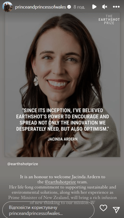 Ардерн, занимавшая пост премьер-министра Новой Зеландии с октября 2017 по январь этого года поблагодарила принца Уильяма за доверие. В сентябре 2022-го Джасинда посетила саммит Earthshot Prize Innovation Summit в Нью-Йорке, где выступила от имени принца Уэльского, оставшегося в Великобритании после смерти Елизаветы II.