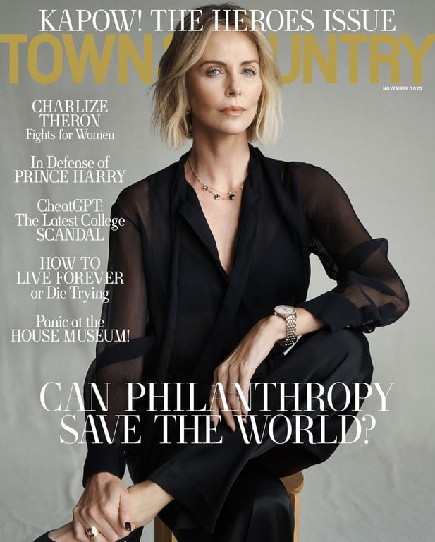 Актриса Шарлиз Терон стала героиней нового выпуска журнала Town & Country. Для обложки она надела прозрачную черную блузку Dior, серьги Dior за 21 100 долларов и черные брюки от Nili Lortan. Актриса снялась в сером джемпере Fendi за 2350 долларов и юбки в тон за 2250 долларов. Также звезда поделилась личными переживаниями.