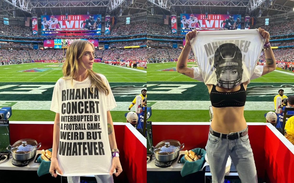 Просмотр финальной игры сезона в профессиональном американском футболе, Супербоуле, это традиция в США. Билеты на мероприятие разлетаются мгновенно, а за трансляцией следят десятки миллионов. Супербоул-2023 не пропустили и знаменитости. Еще бы — на сцене впервые за пять лет выступила певица Рианна.