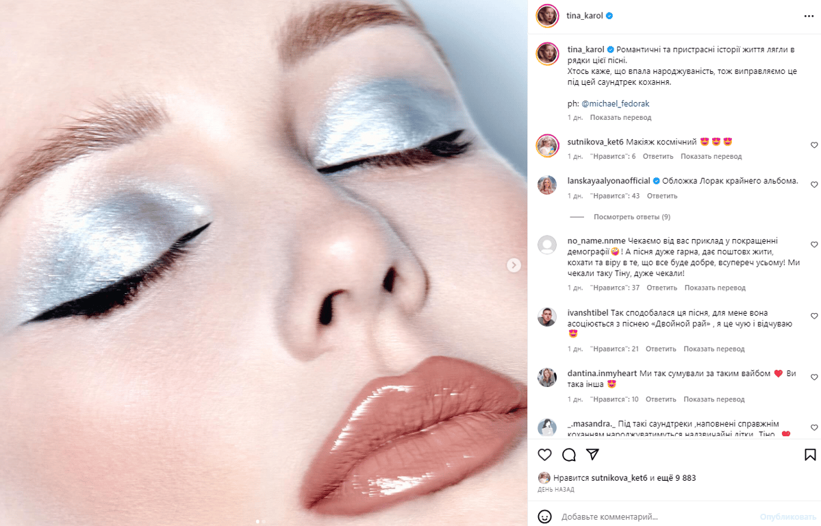 Известная украинская певица Тина Кароль представила новую песню, которую она посвятила любви. Популярная артистка показала новую обложку, за которую получила критику от подписчиков социальной сети Instagram, где похвасталась красивым макияжем.