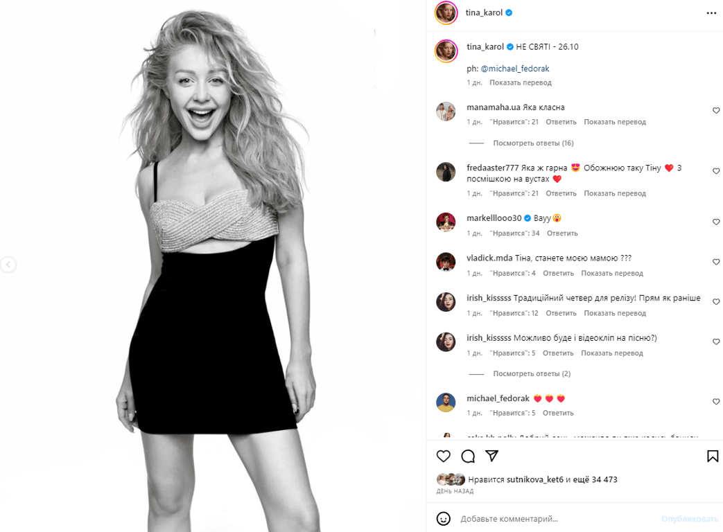 Соответствующую публикацию Тина Кароль разместила на своей странице в социальной сети Instagram.
