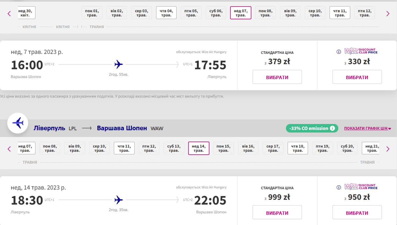 Из-за полномасштабной войны пассажирские аэропорты по всей стране закрыты более года. Рассмотрим вариант вылета в Ливерпуль из Польши. Прямых рейсов национального перевозчика LOT в английский город не имеет, как и с пересадками. Но венгерский лоукост Wizz Air и ирландский Ryanair предлагают воспользоваться их услугами. И в ценовой политике выигрывает сосед Великобритании, потому что цена отличается в разы.