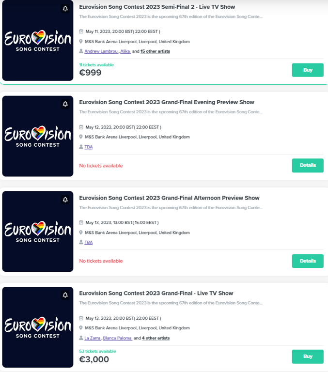 Билеты на гранд-финал были от 80 до 380 фунтов стерлингов (от 3500 до 16 850 грн), на полуфиналы — от 30 до 290 фунтов стерлингов (ориентировочно от 1330 до 12800 грн).