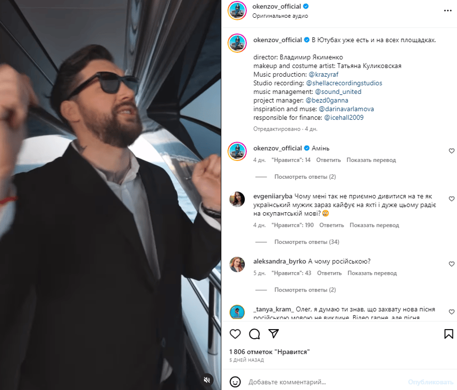 По словам Богдана Беспалова, пока украинцы защищают нашу землю от российской агрессии, Олег Кензов живет в своем мире. Блогер считает, что своими русскоязычными песнями украинский артист продвигает культуру страны-агрессора.