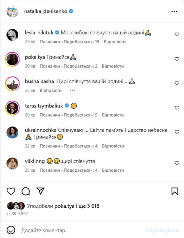 Одними из первых свои соболезнования выразили коллеги звездной пары: актер Тарас Цымбалюк, шоувумен Леся Никитюк, блогерша Екатерина Полтавская (жена Владимира Остапчука) и другие.