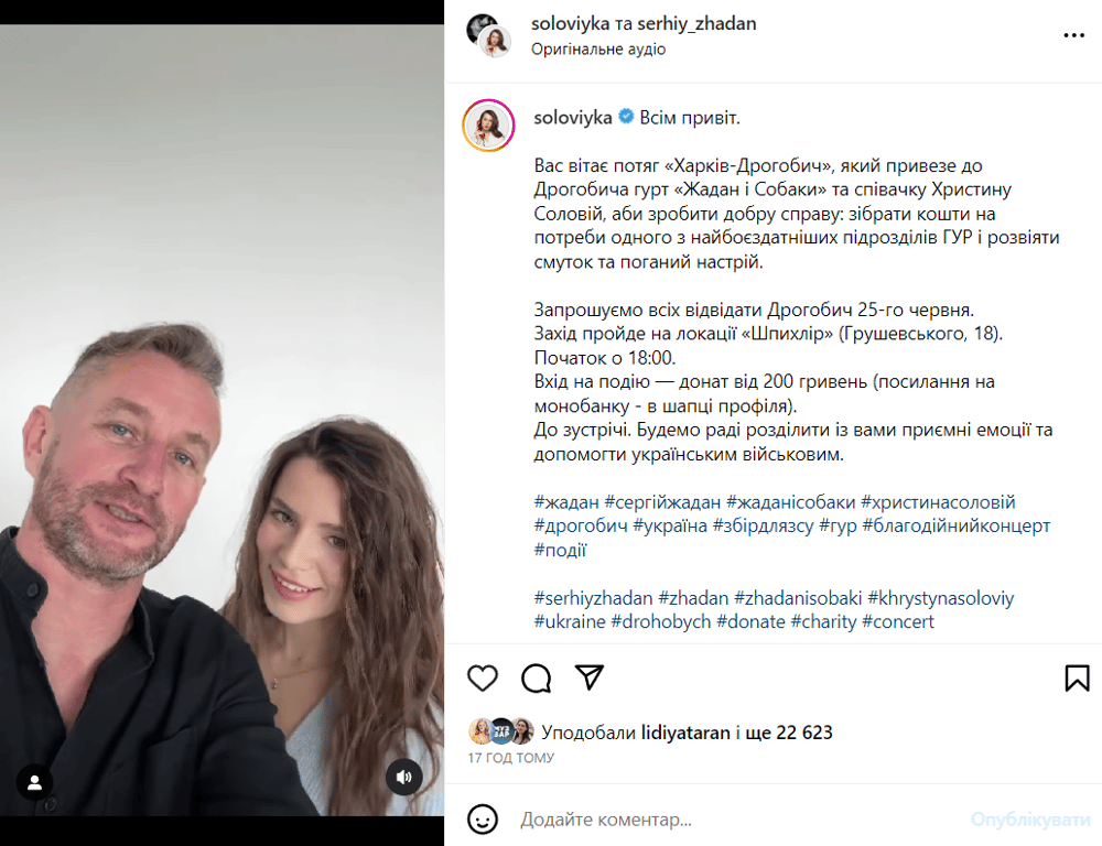 Артисты анонсировали совместный концерт в родном городе Соловий, Дрогобыче (Львовская область). На видео звезды стоят около друг друга, выглядят счастливыми, но никаких объятий и поцелуев подписчики не увидели. Как и не услышали подтверждения или опровержения информации о романе.