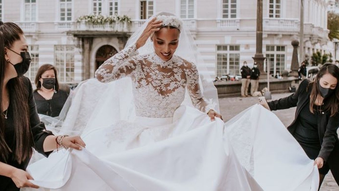 Модель Жасмін Тукс і директор Snapchat Хуан Давид Борреро влаштували одну з пишних церемоній. Не менш пишним було і вбрання нареченої - приголомшлива сукня від Zuhair Murad. Образ мав довгі рукави, пишну спідницю та шлейф. А свій образ Жасмін доповнила мереживною фатою.