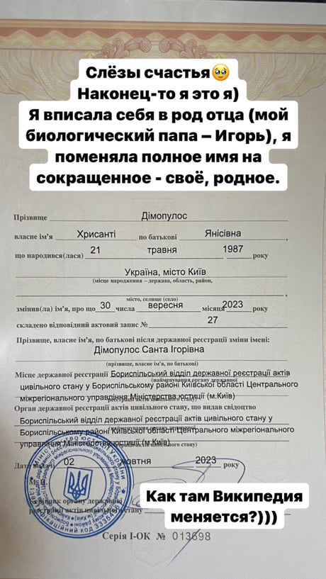 "Сльози щастя! Нарешті я — це я. Я вписала себе в рід батька (мій біологічний тато — Ігор). Я змінила повне ім'я на скорочене — своє, рідне", — прокоментувала співачка.