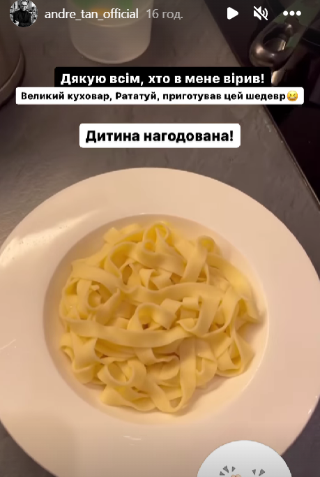 За кілька хвилин дизайнер показав результат свого експерименту. Себе він назвав великим кухарем Рататуєм та попросив підписників похвалити його. На жаль, коментувати сторіз не можна. Залишається тільки здогадуватися, як шанувальники Андре Тана відреагували на такі зізнання дорослого чоловіка.