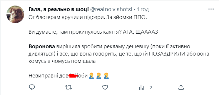 Співачка опублікувала відео, на якому вона під фільтрами, з усмішкою та російською мовою ділиться враженнями після візиту СБУ до її квартири в одному з ЖК на лівому березі столиці. Воронова зазначила, що вона не має права розголошувати деталі, втім підписникам вона пообіцяла обговорити це згодом.