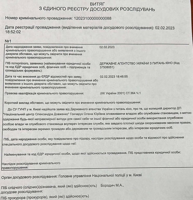 Наприкінці минулого року Держкіно відсторонило від виконання обов'язків в.о. генерального директора ДП "Національний центр Олександра Довженка" Олену Гончарук. За добу до проведення конкурсу, який проходить в п’ятницю, 3 лютого, стало відомо, що проти Гончарук відкрили кримінальне провадження. А будівля Держкіно замінована.