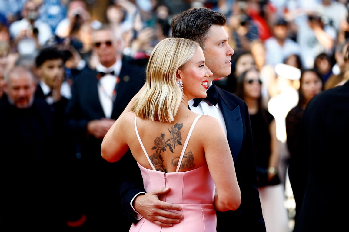 Так, на червоній доріжці разом з чоловіком, коміком Коліном Джостем у відкритій сукні позувала 38-річна американська акторка Скарлетт Йоганссон. Гості прем’єри могли спокійно роздивитися величезне тату зірки на спині та декілька маленьких на інших частинах тіла.