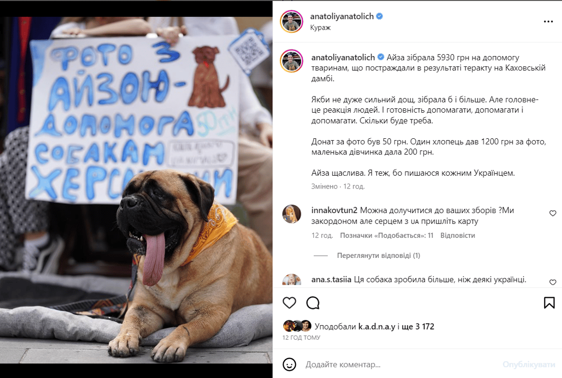 Скільки грошей зібрала собака Анатоліча на допомогу тваринам Херсонщини