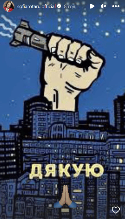 Не стала змінювати собі Ротару й цього разу. Артистка подякувала ЗСУ та силам протиповітряної оборони. Софія Михайлівна опублікувала малюнок, на якому рука воїна упіймала та тримає ракету ворога над мирним містом.