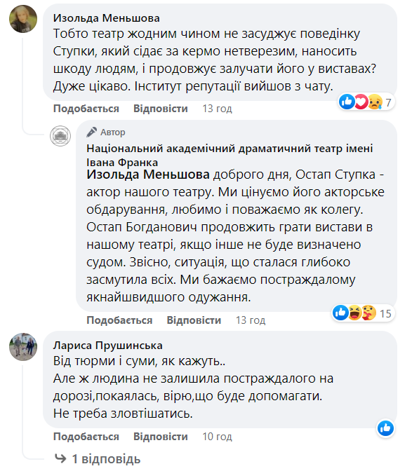 Шанувальники Ступки та культурної установи поцікавилися, чи означає це звільнення Остапа, і попросили прокоментувати скандальне ДТП.