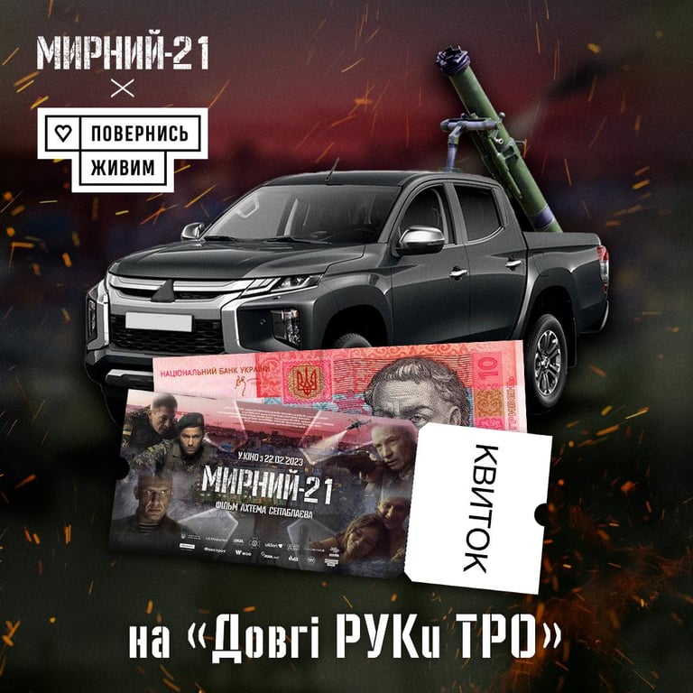 10 гривень з кожного проданого квитка на фільм "Мирний-21" спрямують на купівлю розвідувально-ударного комплексу (РУК) зі 120-мм мінометами для 111-ої окремої бригади територіальної оборони Луганської області. Комплекс складається із шести мінометів і трьох пікапів, а також засобів зв’язку, живлення, аеророзвідки, оптики. Ціль збору — 10 млн 800 тисяч гривень.