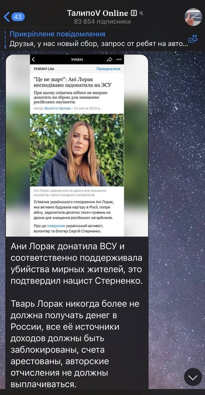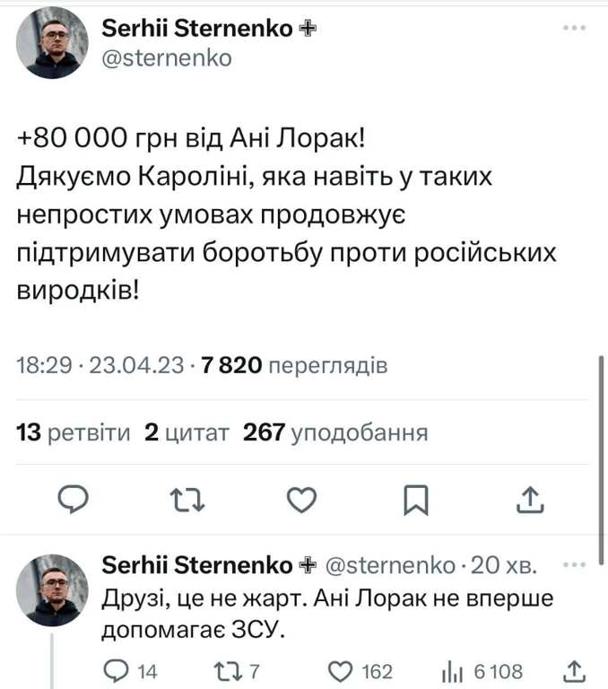 Вже не один у соцмережах з'являлась інформація про нібито підтримку ЗСУ зрадниками, зокрема співачок Таїсії Повалій та Ані Лорак (справжнє ім’я Кароліна Куєк). 28-річний активіст з Одеси стверджує, що остання задонатила українським військовим 80 тисяч гривень.