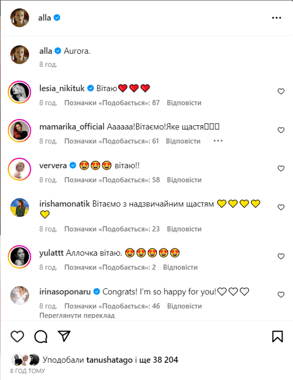 Одними з першими Аллу та її чоловіка привітали співачки Віра Брежнєва (Кіперман), MamaRika, продюсерки Ірина Монатік, Юла, шоувумен Леся Нікітюк, акторка Ірина Сопонару та інші.