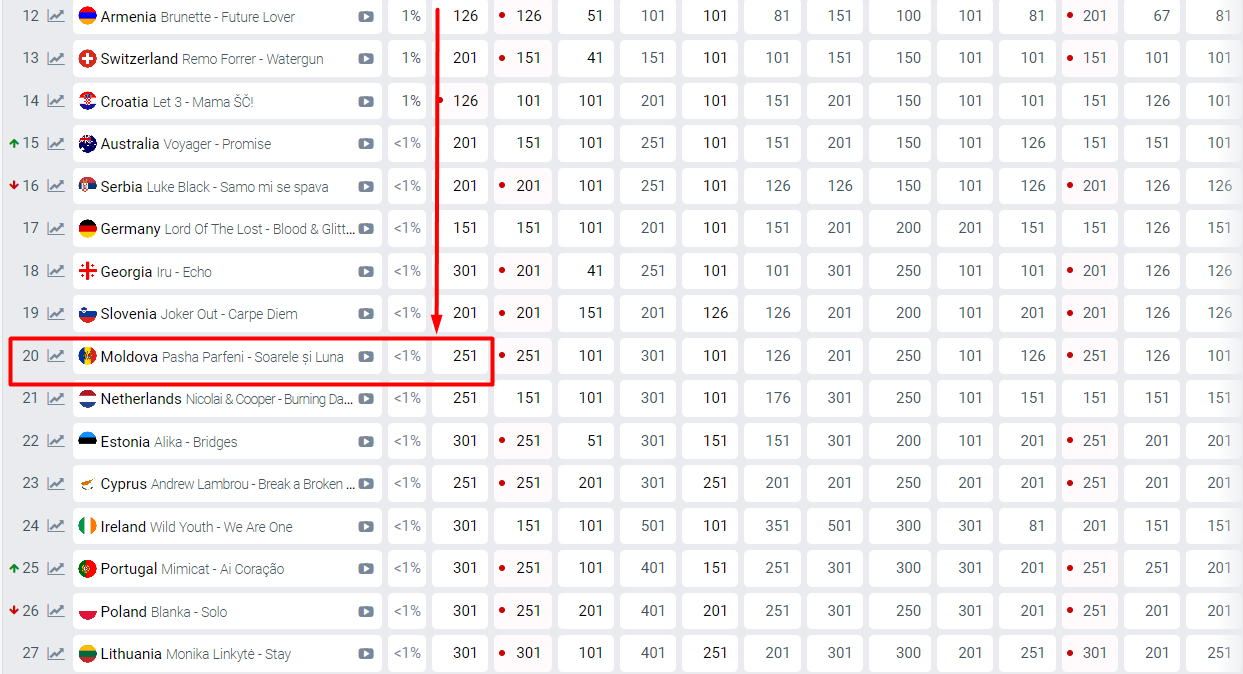Букмекерські контори не ставлять на перемогу Паші. Втім в нього є всі шанси кваліфікуватися до фіналу. В молдованина коефіцієнт складає 251. В той час, як в українського гурту TVORCHI він 12 (третє місце), а у фаворитки Loreen зі Швеції 1.53.